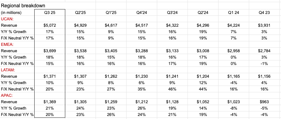 While reviewing the regional breakdown of Netflix's revenue streams, we can observe that the company is setting records across all regions. Most interesting, APAC (Asia-Pacific), the region with the smallest revenue stream, is showing the highest Year-over-Year (Y/Y) growth and is on a strong path to surpass LATAM (Latin America) in revenue contribution. Furthermore, saturated markets like North America (UCAN) and Europe (EMEA) are still seeing surprisingly significant Y/Y growth numbers. This resilience strongly suggests that Netflix's recent strategy of stopping shared accounts is providing highly effective and is returning great results on their financial structure.