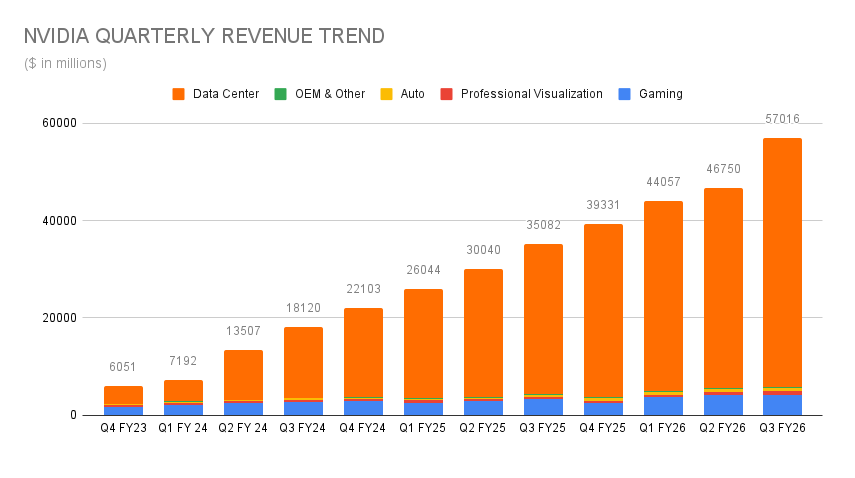 The standout performer was the Data Center segment, which posted record revenue of $51.2 billion; 25% increase from the previous quarter and 66% year-over-year. This division now accounts for nearly 90% of NVIDIA's total revenue. While Gaming (up 30% year-over-year) and Automotive (up 32% year-over-year) showed solid growth and even reached record levels, they remain far less material in the overall picture.