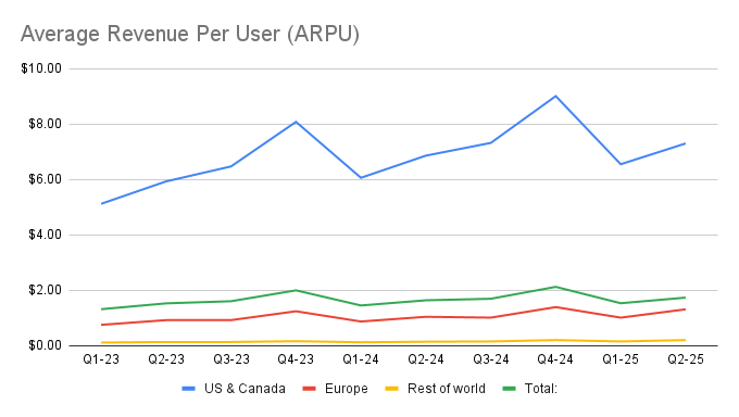 Meanwhile, Europe’s ARPU grew by 26% to approximately $1.30, and the U.S.&Canada saw a 6% increase, reaching $7.29.