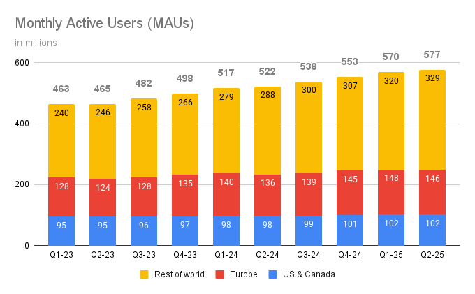 In the U.S. and Canada, MAUs held steady compared to the previous quarter, but when compared to Q2 2024, there’s still a solid 5% increase. Europe saw a slight dip when compared to last quarter, from 148 million to 146 million, but year-over-year, that still represents a 7% gain.