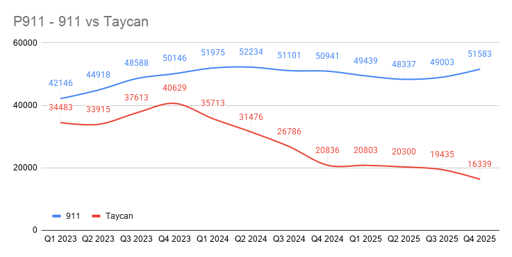 To understand the scale of the EV misstep, it helps to look at what happened to Taycan and 911 sales side by side throughout this period. The 911 was always combustion-powered, and it was precisely the model that the Taycan was supposed to eventually replace. Instead, the opposite happened. Taycan peaked at over 41,000 units in 2021 and has since collapsed to around 16,000 by 2025, a decline of nearly 60% from its best year. The 911, meanwhile, kept growing and reached around 52,000 units in 2025. The market delivered a very clear sign, and Porsche is only now fully accepting it.