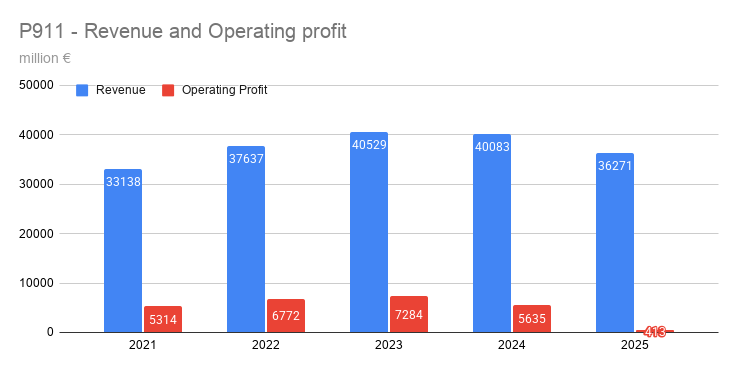 As one of the most famous luxury and performance carmakers in the world, Porsche holds an interesting position with a strong economic moat. Annual revenue currently stands at around €36.3 billion, which is just under 10% below last year's figure. At the same time, operating margin dropped to 1.1% — a steep fall from the 14.1% reported in 2024.