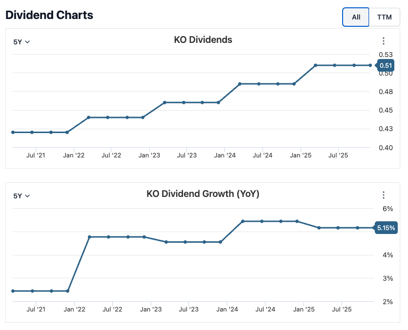 Coca-Cola is a textbook example of a dividend stock that fits my criteria and is also the first stock I bought for my passive portfolio. The company has paid and increased its dividend for more than six decades, making it one of the most reliable income generators in the market. Its dividend yield comfortably sits above 2.1%, supported by stable cash flows and one of the strongest consumer brand moats in the world. With global distribution, pricing power, and predictable demand, Coca-Cola offers dividend investors both stability and consistency.