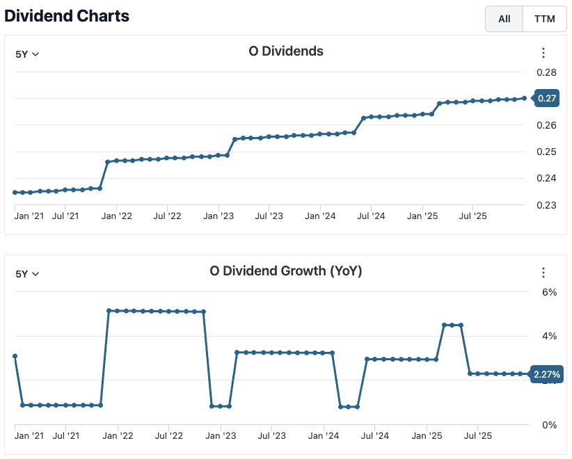 STAG Industrial offers exposure to the industrial real estate sector with a clear focus on income stability (they are renting their properties to some of the industrial giants, like Amazon, FedEx, UPS, DHL and others). The company benefits from long-term leases and growing demand for logistics and warehouse space, which supports consistent cash generation. While its dividend history is shorter than some classic dividend aristocrats, STAG has demonstrated commitment to sustainable payouts and gradual dividend growth. Its specialized niche and disciplined capital allocation make it an attractive dividend holding within the REIT segment.
