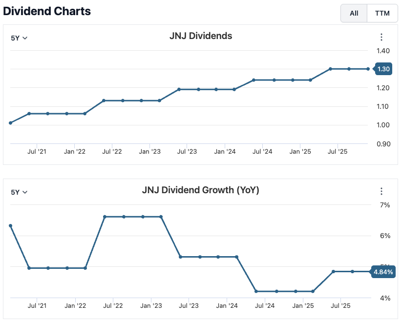 Johnson & Johnson represents one of the strongest dividend profiles in the healthcare sector. With more than half a century of consecutive dividend increases, the company demonstrates great financial discipline and stability. Its diversified operations across pharmaceuticals, medical devices, and consumer health help smooth earnings cycles and protect cash flow. This stability, combined with a durable competitive moat, makes Johnson & Johnson a core dividend investment for long-term investors.