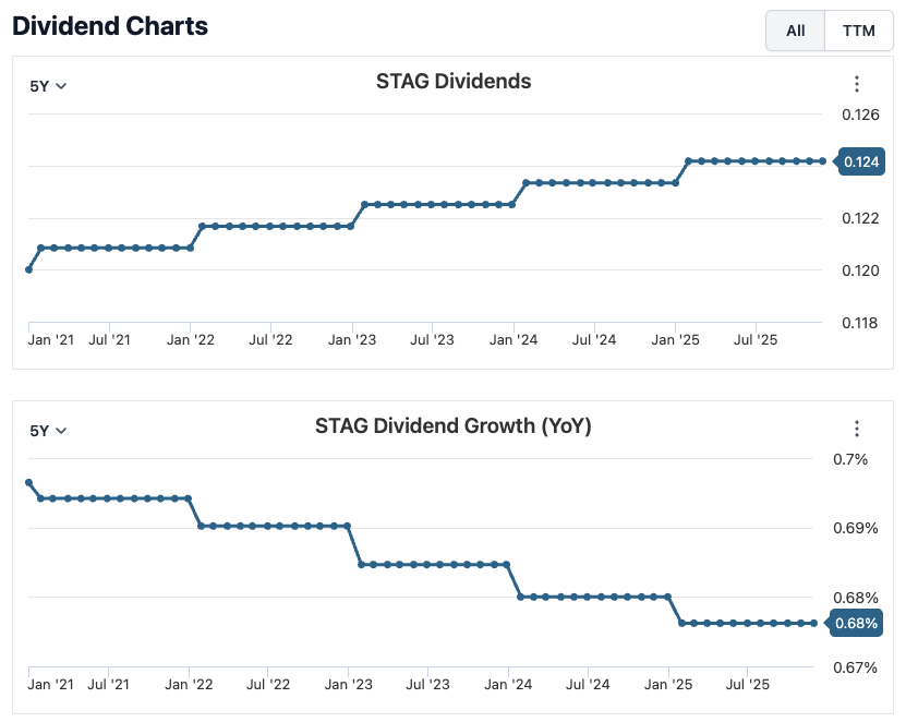 STAG also pays dividends to investors on a monthly basis, while dividend increases are implemented on a yearly basis.