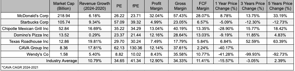 It is interesting to compare these companies side by side. Many of them have seen meaningful declines in their stock prices. The largest drawdown occurred at Wendy’s, whose shares now trade at the lowest valuation in the group, with a P/E ratio of 8.82 compared an industry average of 34.65.