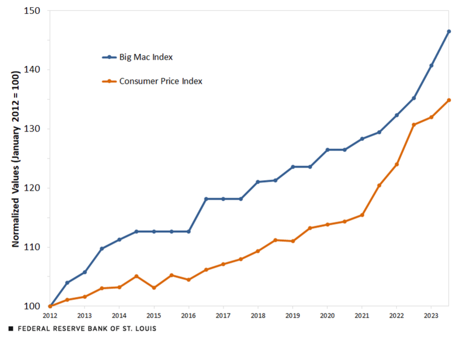 One useful way to understand how inflation has affected fast food is through the Big Mac Index, indicator created by The Economist. The index tracks the price of a Big Mac across countries as a simple, real-world proxy for consumer inflation and purchasing power, since the product uses a consistent basket of inputsbeef, bread, labor, rent, and energy. In recent years, however, the price of a Big Mac has risen significantly faster than the broader Consumer Price Index (CPI). Between 2020 and 2024, the average U.S. Big Mac price increased from roughly $5.71 to $7.29, a gain of about 27%, while overall consumer inflation and wage growth rose at a meaningfully slower pace.