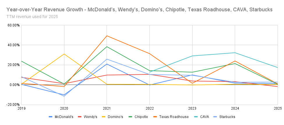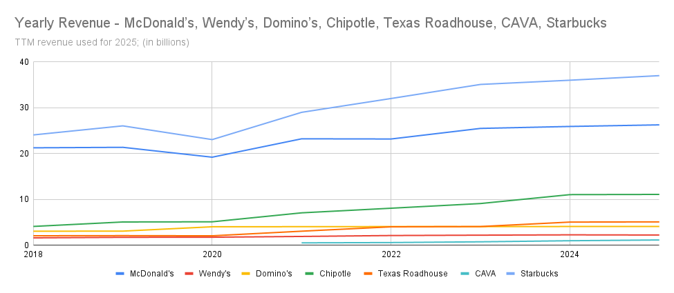 Revenue and Revenue Growth in Fast Food industry: McDonald's, Starbucks, Wendy's, Chipotle, Domino's, Texas Roadhouse, CAVA