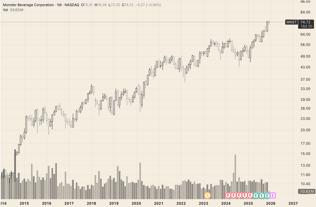 If someone asked you to name a stock that has delivered a steady ~11% annual price growth over the past decade - compounding to roughly 194% in total - while operating in almost every corner of the world, a beverage company would likely not be the first answer. Yet Monster Beverage is exactly that.