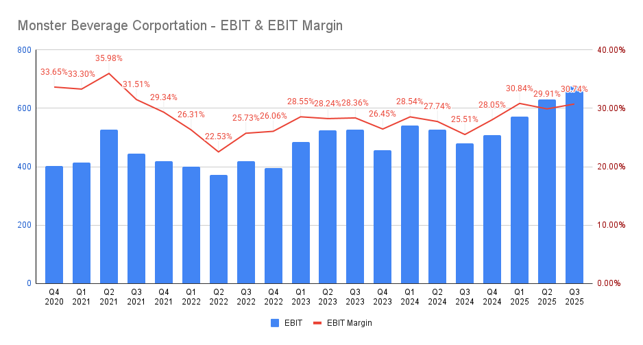 For the same reasons, gross margin expanded to 55.7%, up from 53.2% a year earlier, representing an improvement of more than three percentage points. Another key metric closely watched by value investors is Earnings Before Interest and Taxes (EBIT). Here again, Monster delivered strong results, increasing EBIT to $2,385 million, up from $2,007 million the previous year. As a result, the EBIT margin improved to approximately 30%, compared with around 27% a year ago.