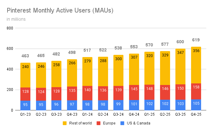 In the report, Pinterest showed that Monthly Active Users reached an all-time high of 619 million. Contrary to the belief that growth in US & Canada is over, the company added another 2 million users in that already saturated region, bringing the total to around 105 million. Europe and Rest of World also increased and are both on the record level.