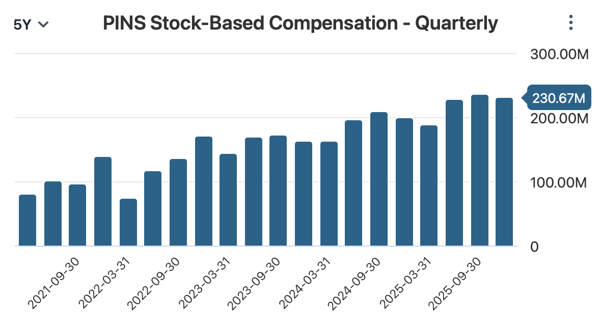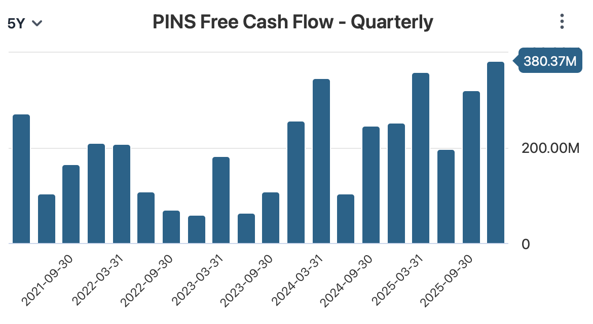 Free Cash Flow is one of the most important metrics when valuing a business. In the case of Pinterest, FCF has been increasing quarter over quarter, which is always encouraging to see.